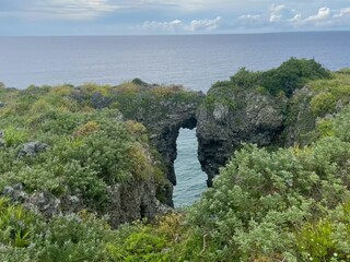 写真は、万座毛の展望台から青い海と迫力ある断崖絶壁の景色です。